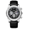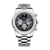 Material da caixa: Aço inoxidável | Espessura da caixa: 15mm | Diâmetro: 46 mm | Tipo de fecho: Fivela | Resistente à Água: 30 m | Visor: Hardlex | Movimento: Quartzo | Material da pulseira: Aço inoxidável | Comprimento da banda: 24cm | Recurso: Calendário Completo e Fases da Lua